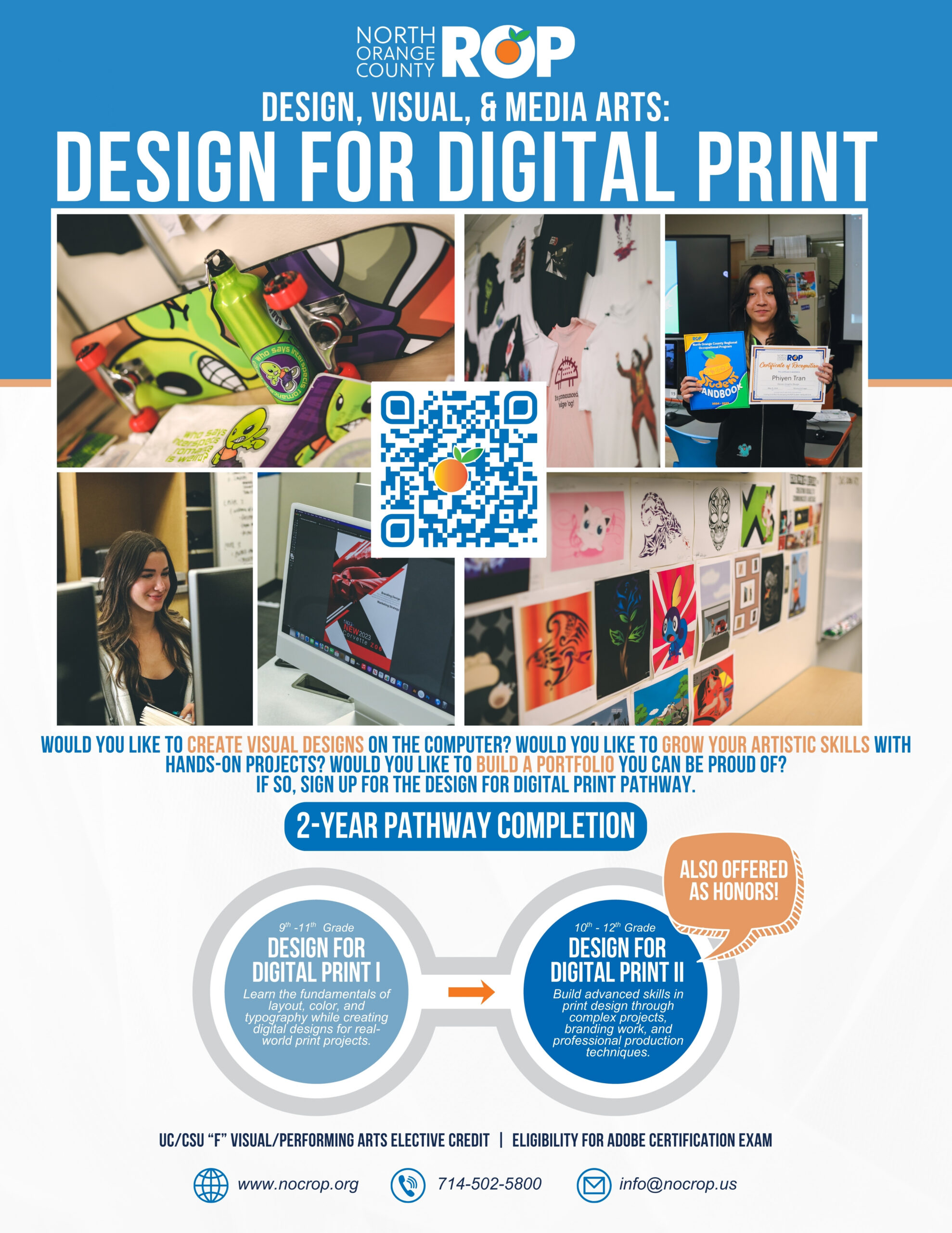 Students may prepare for industry-recognized credentials such as Adobe Certified Professional certifications and benefit from exposure to print shops, marketing teams, and design professionals. This pathway prepares students for careers in graphic design, print production, and visual marketing, as well as continued study in graphic design, visual communications, or digital media.