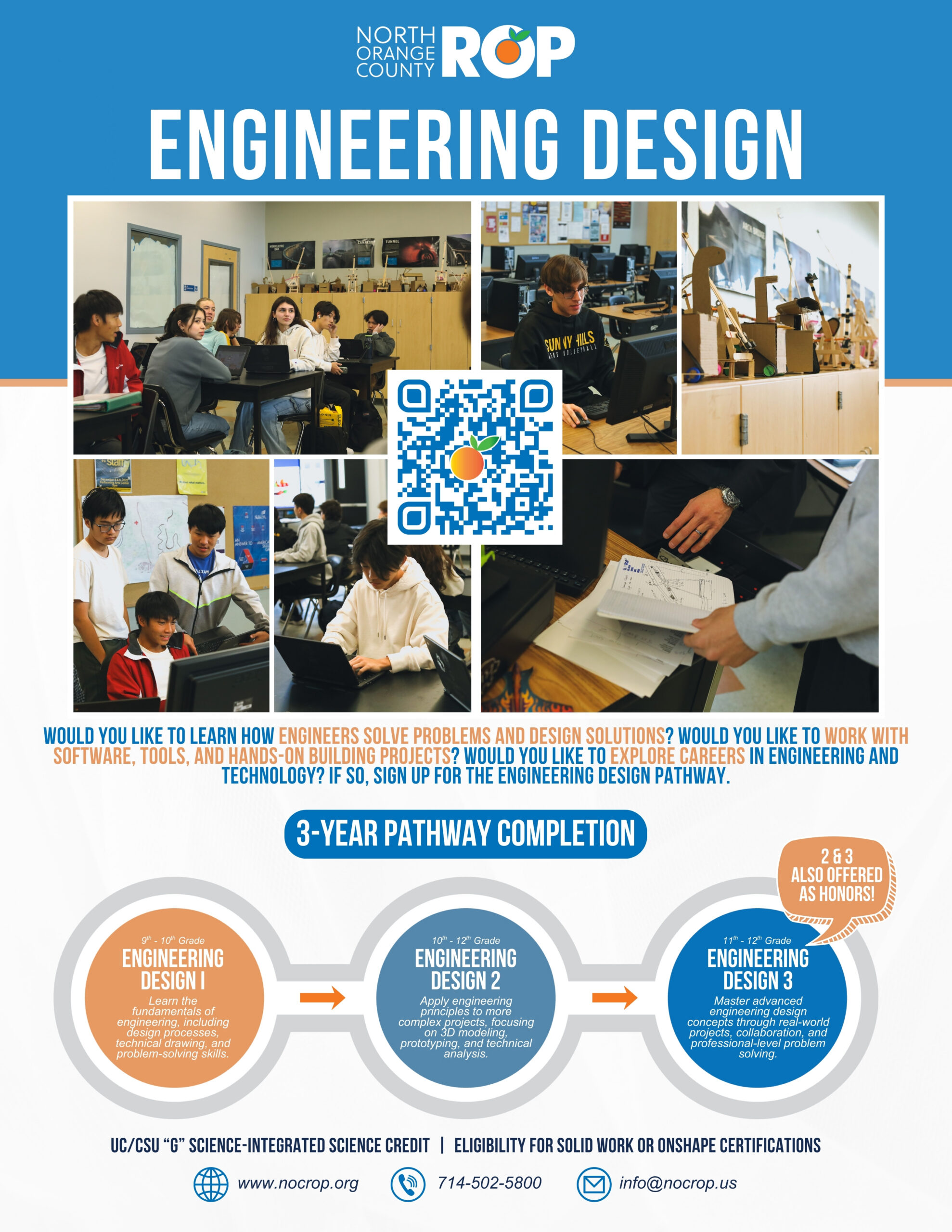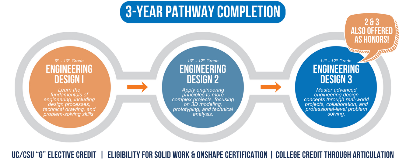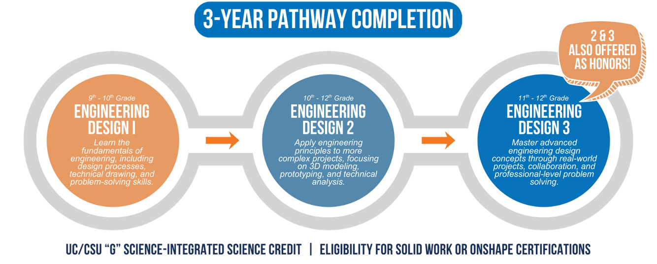 This pathway supports preparation for careers in engineering, design, and technology-related fields and provides a strong foundation for college programs in engineering, architecture, or applied sciences. Students may also have opportunities to prepare for engineering or design software certifications that support postsecondary success.
