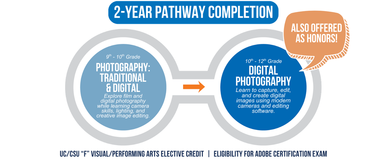 This pathway supports preparation for careers in photography, media, and creative industries, as well as continued education in photography, visual arts, or digital media programs. Students may also have opportunities to prepare for industry-recognized photography or digital media certifications.