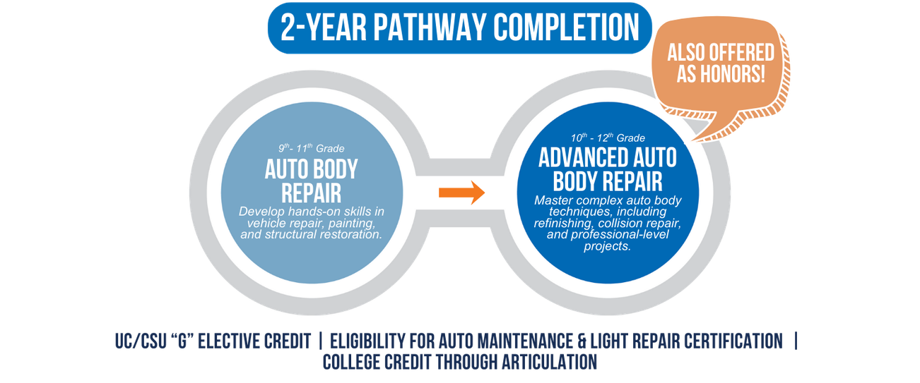 This pathway supports preparation for careers in auto body repair, collision repair, and refinishing, and provides a strong foundation for advanced training or certification programs. Students may also have opportunities to prepare for industry-recognized collision repair or refinishing certifications that support career readiness.