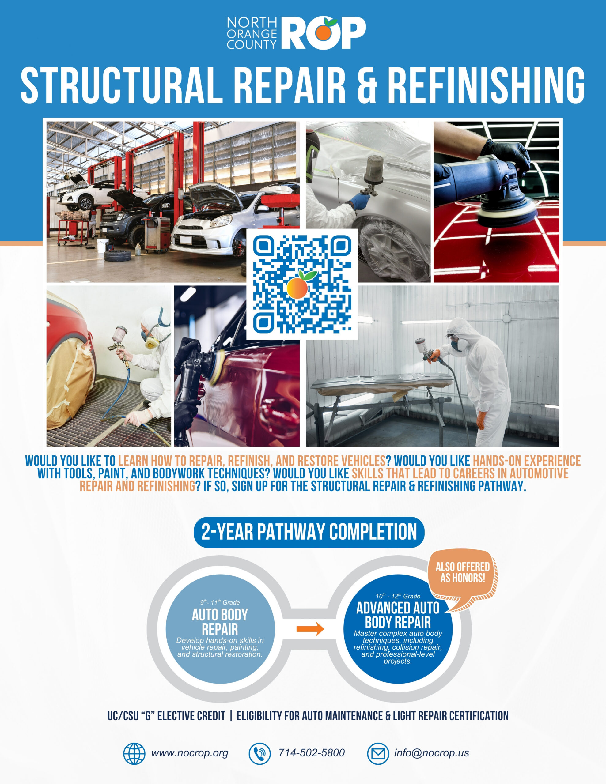 The Structural Repair and Refinishing pathway prepares students for careers in automotive collision repair by focusing on restoring vehicles to safe, functional, and professional standards after damage. Students learn how vehicle structures are designed and how repairs are performed to meet industry and safety requirements.
